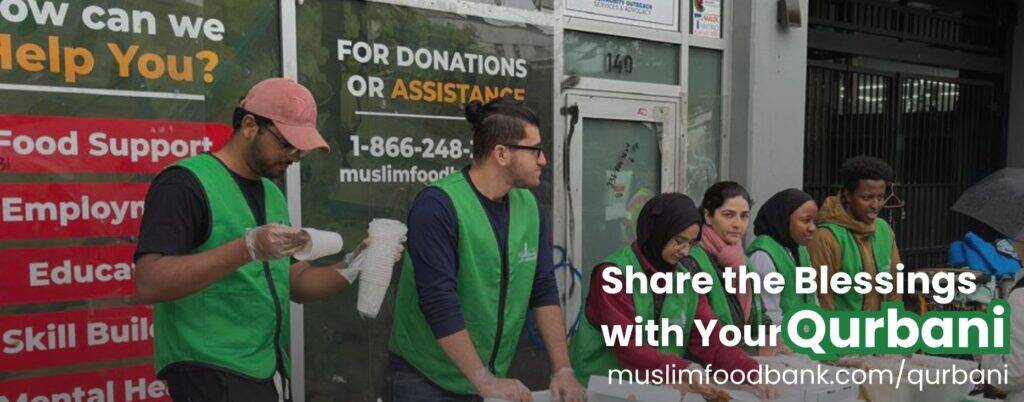 Perform the Qurbani (sacrifice) to commemorate the obedience of Prophet Ibrahim (peace be upon him). This act of worship is a significant tradition in Islam. You can give the gift of Qurbani locally in Canada, serving the most vulnerable through various food banks in cities such as Vancouver, Surrey, Toronto, Calgary, Edmonton, Brampton, Winnipeg, Regina, and Halifax.